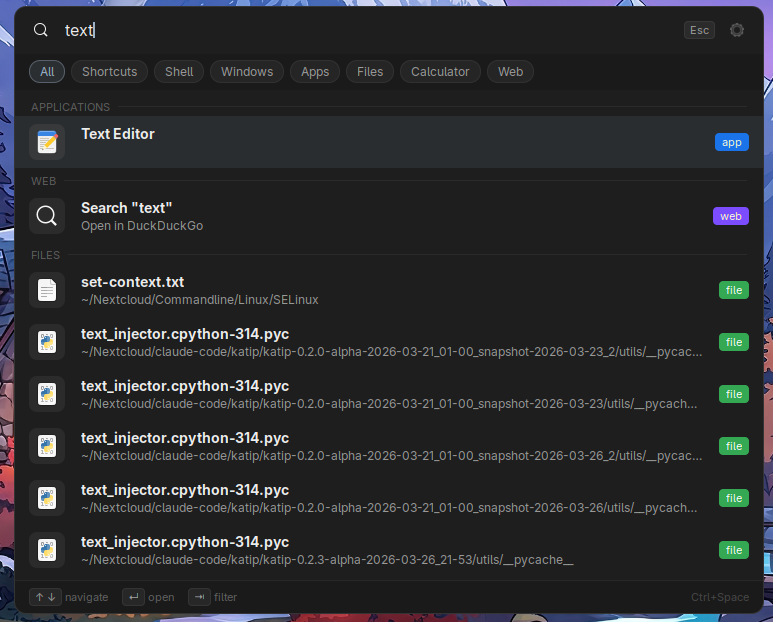 ↑ / ↓to navigate resultsEnterto activateCtrl+Enterfor the alternative action (open containing folder for files, force terminal for commands)Tabto cycle through mode filter chipsEscapeto close