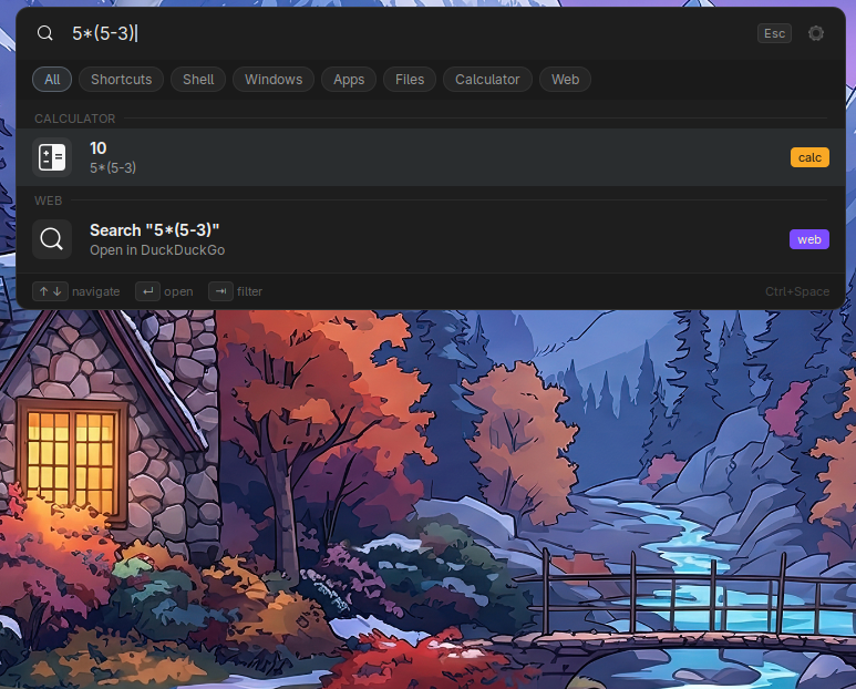 sqrt(144),5 * 1.19,sin(pi/2)),Entercopies result to clipboard - URL detection — typing a domain or URL opens it directly in your browser without a search engine round-trip
