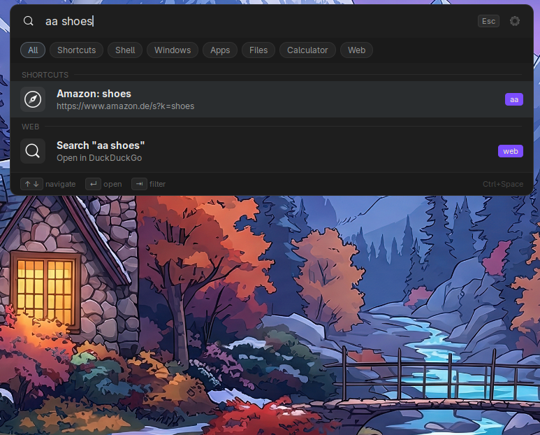 - Mode filter chips to narrow results to a single provider (Windows / Apps / Files / Calculator / Web / Shell / Shortcuts)